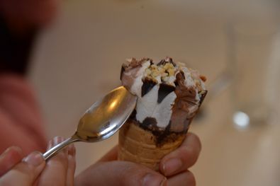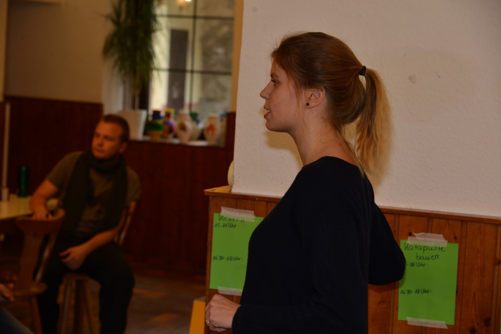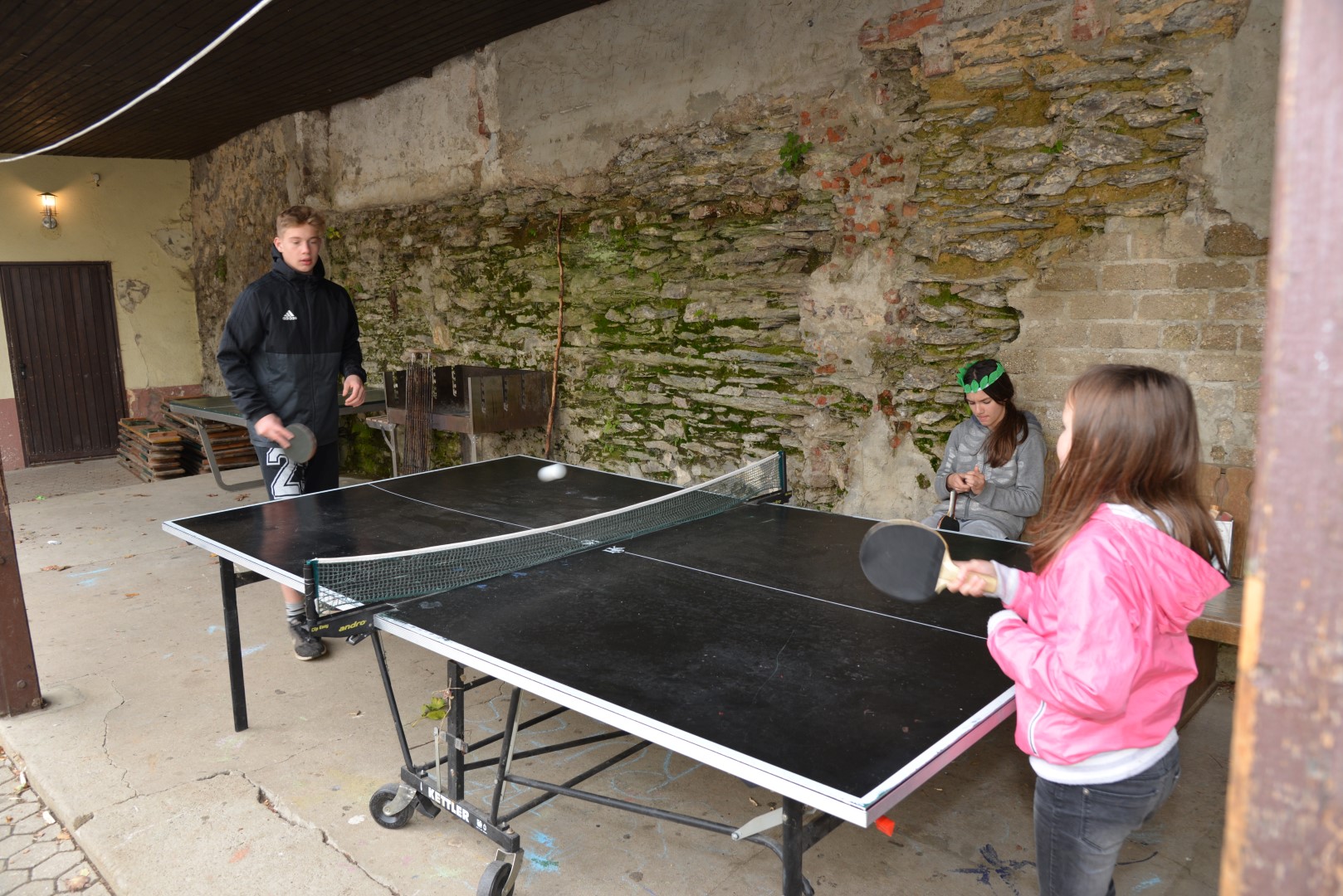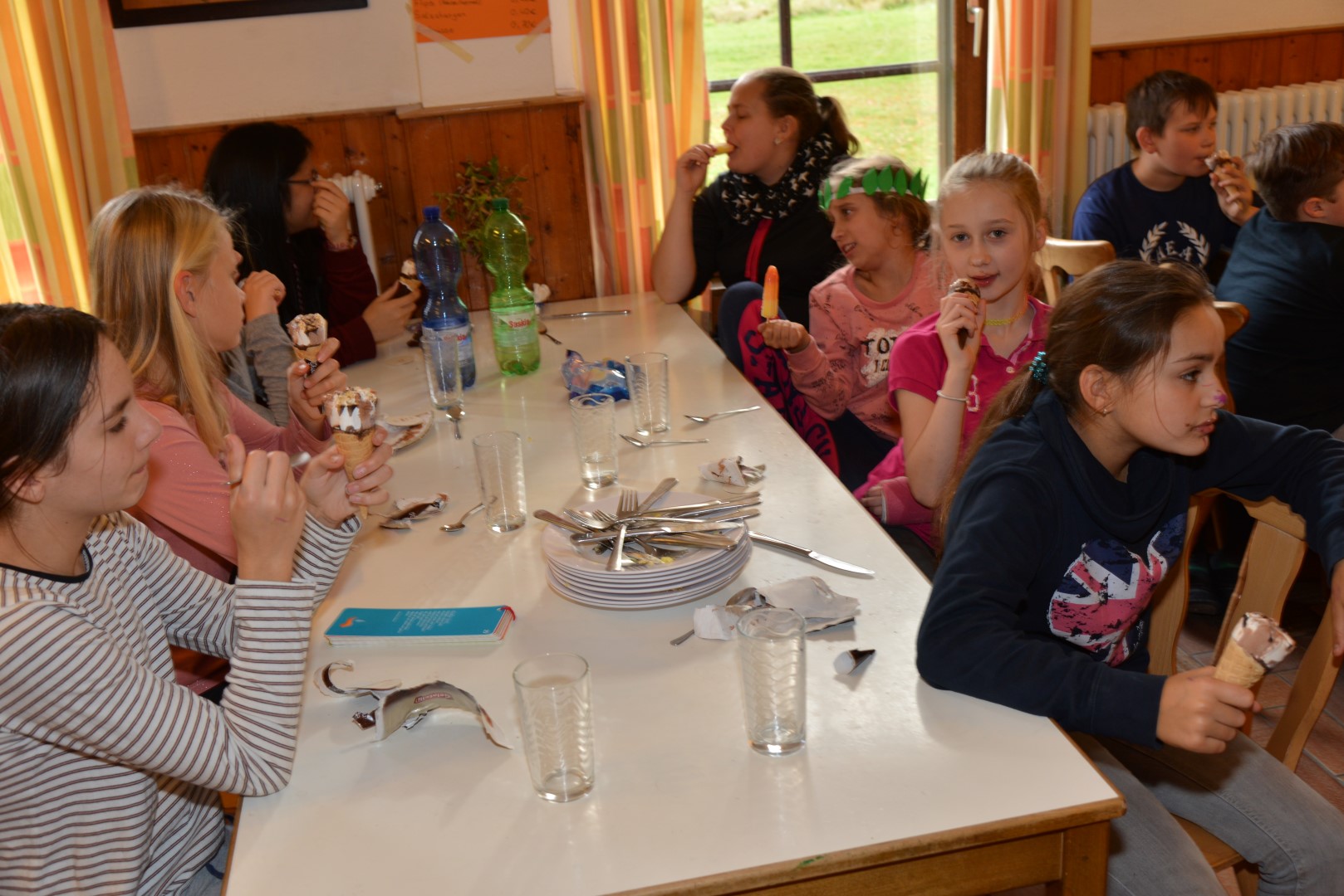 Zum Mittag gab es dann Topfkuchen mit Salat und ein Eis zum Nachtisch. Danach war die Mittagspause, nach der wir verschiedene Workshops angeboten haben. Zum Beispiel: Tischtennis spielen, Kastanienmännchen und Katapulte bauen, Armbänder geflochten und viele mehr.